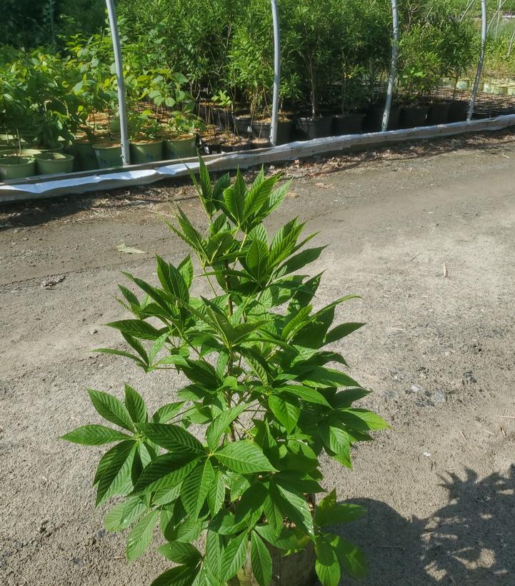 The Ohio Buckeye low-branched deciduous tree with a broad, oval crown. In the summer, leaves possess a dark green color and mature to a lovely yellow in the fall. Greenish-yellow flowers will bloom from April through May which is then followed by warty, spinney fruit called buckeyes. Commonly found in rocky, wooded areas.