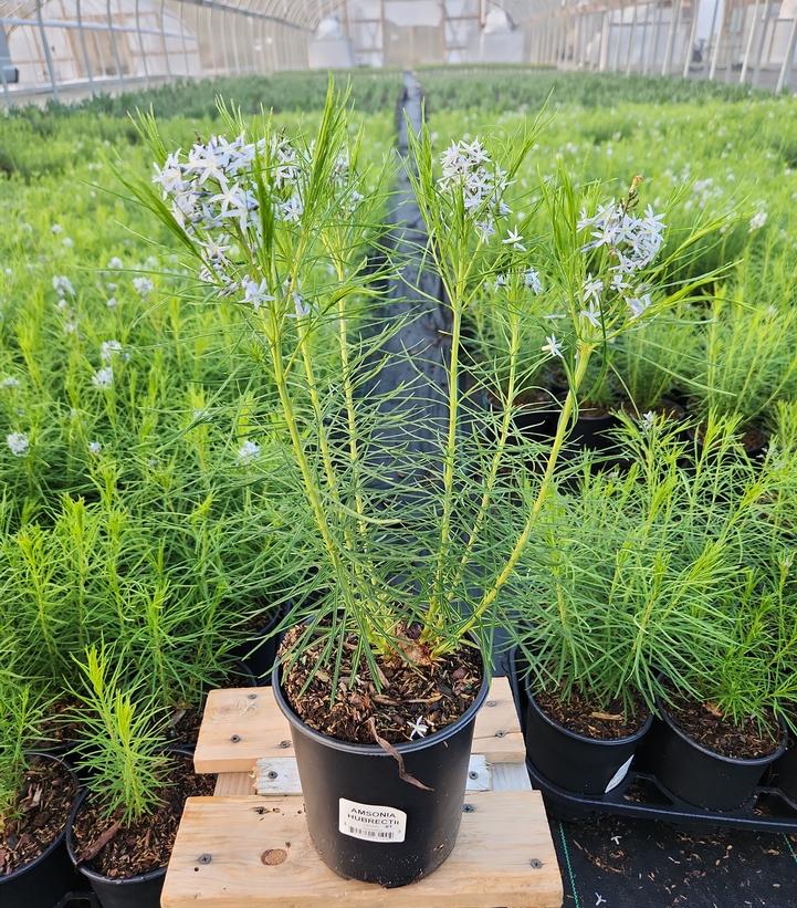 Description- This long overlooked native perennial deserves a prime stretch of real estate in any landscape with its massive flower show, its fine textured form, and its electric fall foliage color display. It's a plant for all seasons and one that is extremely easy to grow and adaptable to moist soils or dry. Foliage emerges deep green and willow-like on a myriad of thick, whip-like stems that form an open, flowing, yet dense mounded presence in the garden. Mid-May is heralded by the appearance of thousands of small, light blue, five petalled stars that group at the top of the stems and put on a show that will draw gasps from your neighbors. The flower show continues throughout June but, once it's done, this plant doesn't just fade away. Its foliage keeps its cool, clean green throughout the summer and, as the weather cools in the fall, explodes into a supernova of yellow color that can be seen from across the yard and beyond. Bluestar loves full sun or light shade and is as carefree in the garden as you can get!