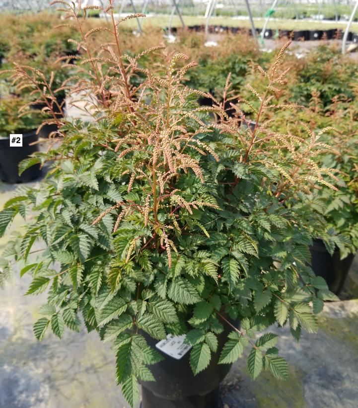 This exciting new hybrid introduced by Dr. Allen Armitage is everything you've always wanted in a Goatsbeard but haven't been able to find to this point. 'Misty Lace' is more compact than the species, more heat and humidity tolerant and extremely cold hardy with a magnificent show of airy white flower panicles on red stems in late May through June. While the old stand by Aruncus has been a great landscape plant, you'll find 'Misty Lace' showier, easier to care for and a welcome addition to any sunny to partially shady area of your garden. Plant it in groups to take advantage of a concentrated flower show and the great texture of its foliage en masse.