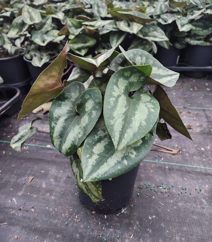 Large, arching dark green leaves are heavily laced with silvery mottling throughout. In spring dark purple 2" flowers emerge. Grow as a groundcover for the woodland garden. Also good for containers or borders.