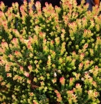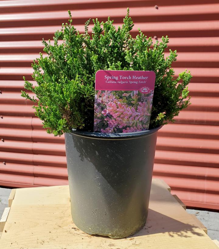 Description- Set your landscape ablaze with this brilliant Heather that has great landscape value not just when it blooms, but also when it flushes its new growth. In early spring, 'Spring Torch' look just like some other green foliaged, compact Heather but look out when its new growth comes out because you might need some sunglasses! All of a sudden this green plant is alive with vibrant shades of yellow, orange and red on its flushing foliage that can't help but light up the spring garden! This new growth slowly fades to a rich, medium green color just in time for the small flower buds that line each stem to open in early July to reveal substantial numbers of medium pink flowers that show up perfectly against this newly rich green foliage. Like all Heather, 'Spring Torch' prefers half to full day sun, well drained soil and protection from winter winds. It is drought tolerant once established.