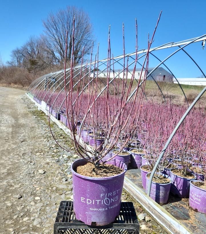 This new introduction from Bylands Nursery in British Columbia has attractive chartreuse foliage and is a compact selection growing 4-5’ tall. It has good sun and heat tolerance, retaining bright leaf color throughout summer without scorching. New leaves are tinged with bronze and the stems have a rich red hue early in the season. Fall foliage becomes a rainbow of purple, red, yellow and orange. In winter the stems turn glossy scarlet red.