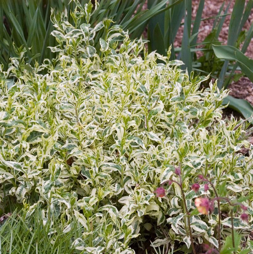Diervilla Cool Splash® is a breakthrough variegated form of the incredibly hardy Diervilla, a tough-as-nails plant that has been used extensively in the northern landscape due to its durability. Found as a chance sport at Cornell University, this bright new beauty has proved to be just as tough and reliable as its green foliaged relatives. Widely banded in snowy white, the lanceolate leaves possess perfect contrast with vivid green centers and will hold fast to this distinct coloration even in a part shade environment. Clusters of small, sunny, trumpet-like blooms smother this graceful, compact plant in May and June, further delighting the eye. Cool Splash® will thrive in partial shade, is drought resistant and will inject just the shot of easy-care foliage color you need in your landscape.
