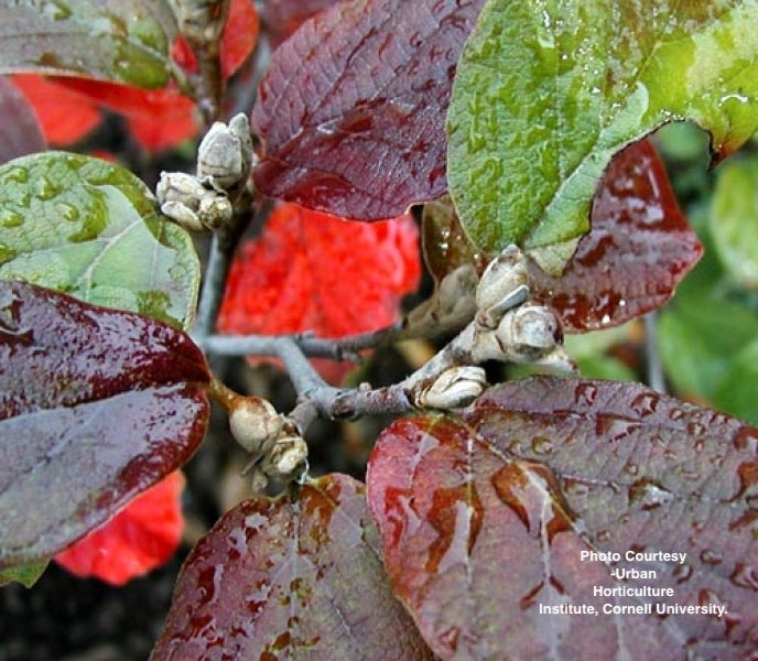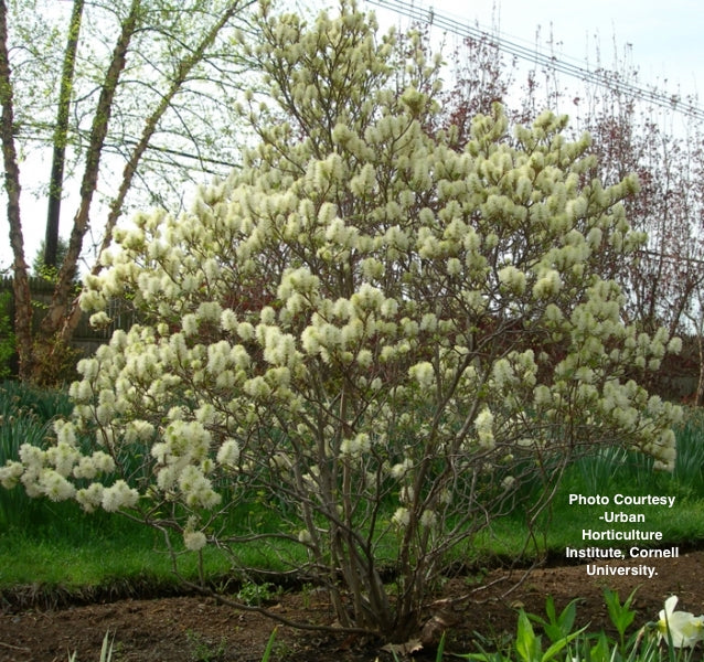 Before leaves emerge, this plant is covered with white, sweetly scented, bottlebrush flowers on the branch ends of its dense, rounded form. Native butterflies and insects flock to the bloom while birds love the cover of its blue-green foliage. Its yellow, orange, and red fall color display is superb! A gem of a shrub! A dense, compact form is ideal for foundation plantings. Flowers are showy and fragrant. Summer foliage is superb followed by a brilliant orange fall foliage show.