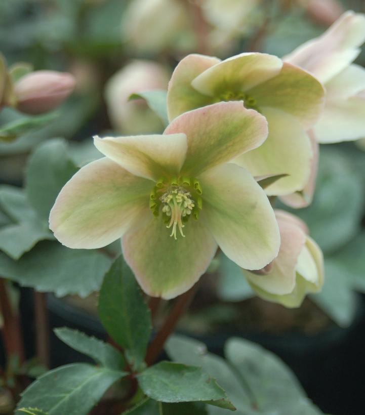 Outstanding Hellebore selection bred by British plantsman David Tristram. Forms a mound of leathery evergreen leaves, veined in silver. Charming, mid-spring display of reddish-pink buds that open into upfacing creamy-white flowers flushed with pink and green. Excellent groundcover, borders, containers and rock gardens.