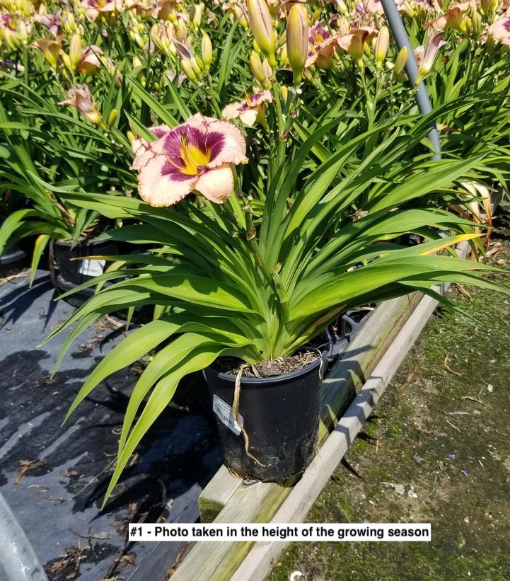 Daring Deception' stretches the bloom season better than almost any other Daylily. And who wouldn't want to see 5.5" flowers that start blooming in June and, because it is one of the best rebloomers you'll ever find, continuing right into the fall? Pink petals feature a ruffled, dark purple ribbon along their edges as they form a flower showcasing a very large, dark purple eye that nearly takes up half the flower! Easy to grow in wet or dry conditions, it is an excellent choice for the middle of a sunny or partially sunny garden with its dark green foliage serving as a backdrop for smaller blooming perennials! Try 'Daring Deception' planted as the centerpiece of a large container for excellent texture and flowers all summer while handling the drought conditions most containers can occasionally experience in without missing a beat