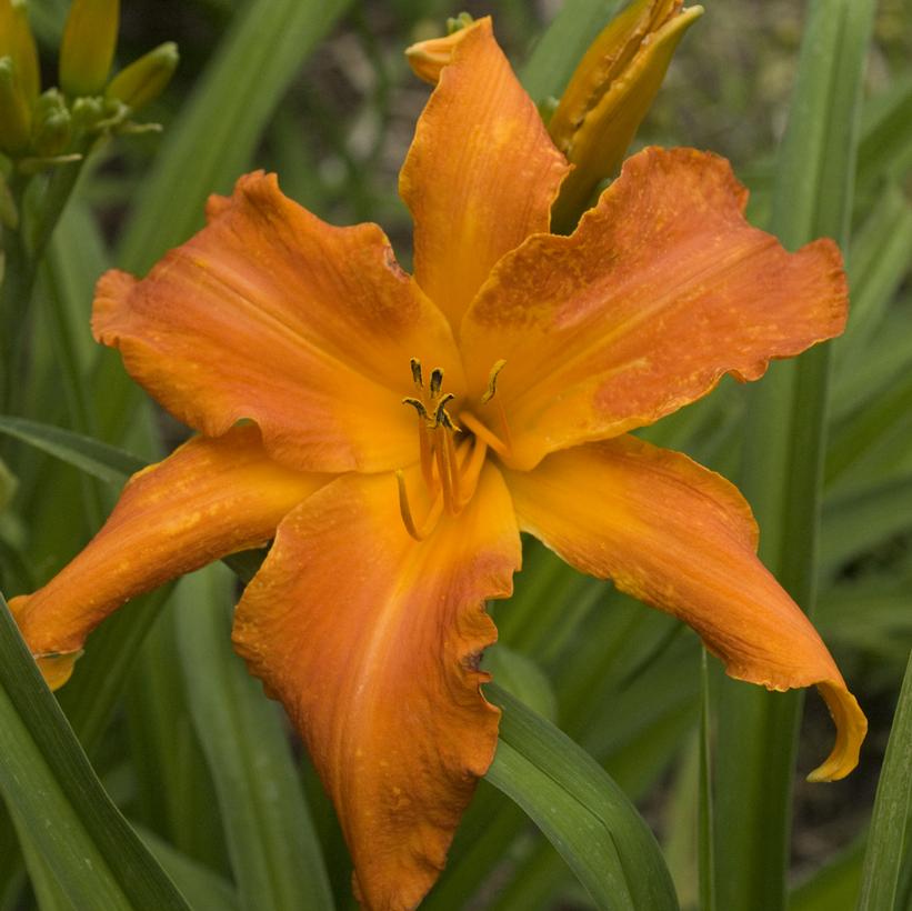 Nothing comes close to the spectacular 7.5-8.5", glimmering tangerine orange, gold dusted blossoms and green throat of this selection. Officially classified as "unusual form", the tepals are narrow, twisted, and re-curved with loosely ruffled edges. These gigantic blossoms open in late July and August on tall scapes above the attractive arching foliage. With such a mammoth bloom and unique look, this selection will shine in your garden whether planted alone or in groups in the middle of any perennial garden.
