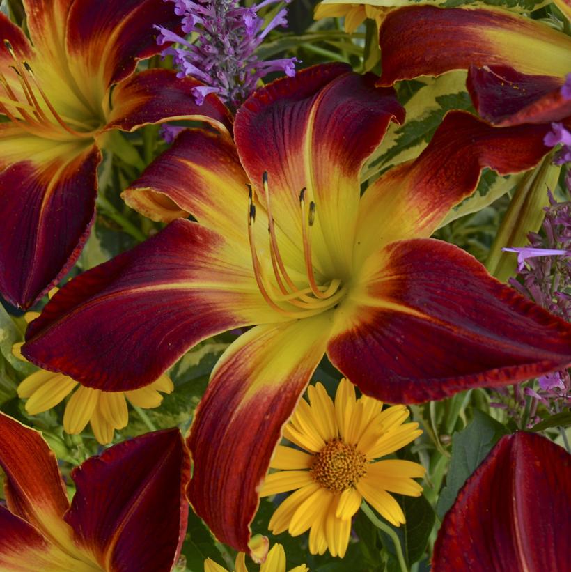 If you are looking for a show stealing plant in your garden, why not try 'Ruby Spider' with its massive 9"+ diameter flower! Great bloom size combines with unusual 'spoon' shaped petals to present a flattened flower form that shows in spectacular fashion with its dark, ruby red color with brilliant yellow center. Easy to grow and very tolerant of drought conditions, this late July bloomer is perfect for a spectacular grouping in a partial to full sun garden.