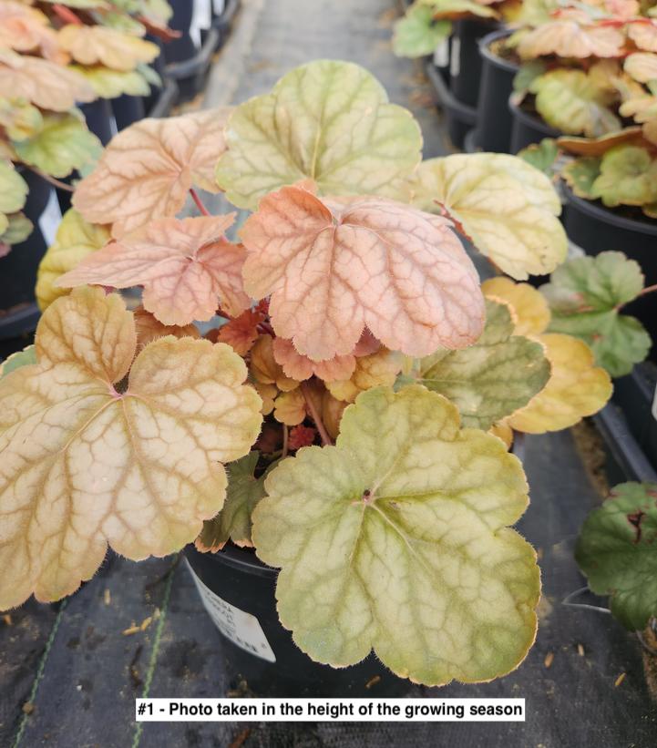 Thick, maple-like, rich, pink-apricot foliage deepens to burnt orange as the season matures, forms a pleasing, colorful tight mound. Flower stems rise above foliage bearing pink bell flowers through June. Deer resistant. Attracts butterflies and hummingbirds. Drought resistant when established. Colorful for massing in partial sun areas. Thrilling used in a mixed perennial deck container. Easy to grow.