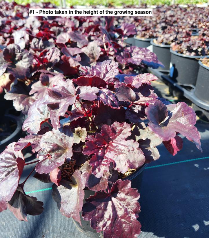 Selected for superior vigor over all other "black" Heuchera. Grows larger mounds and more textured foliage along with pleasing sprays of cream-colored flower spikes in mid-summer. Excellent vigor, good tolerance of heat as well as sun or shade, make this a “grow anywhere” perennial.