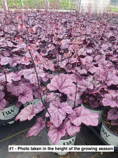 Get a splash of purple in your garden! Large, scalloped, incredibly glossy leaves are a bold shade of purple. Charcoal veins accent the leaves. Dark stems hold rosy pink calyxes and white flowers.