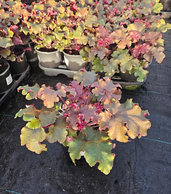 Thick, maple-like, rich, deep red to almost black foliage forms a pleasing, colorful tight mound that retains its spectacular color even in the heat of summer. Flower stems rise above foliage bearing white bell flowers through June. Deer resistant. Attracts butterflies and hummingbirds. Drought resistant when established. Colorful for massing in partial sun areas. Thrilling used in a mixed perennial deck container. Easy to grow.