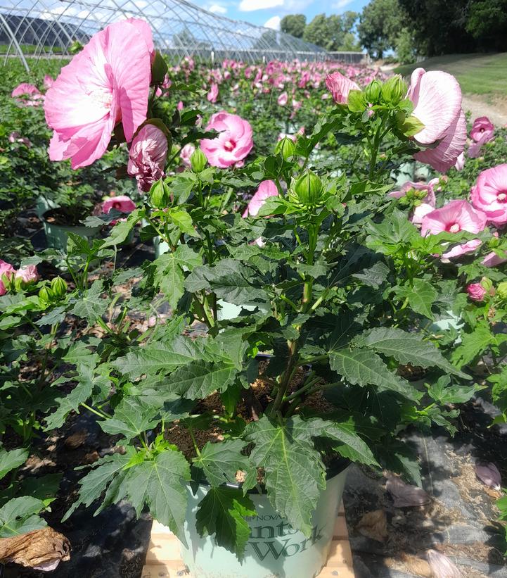 Vibrant pink flowers with salmon tones have an airbrushed central white halo and a small dark red eye. Overlapping petals create a three-dimensional look to the flowers. The rich, dark green foliage forms a compact habit. Lots of flower buds translate to a long season of bloom, so you can enjoy these flowers for many weeks.