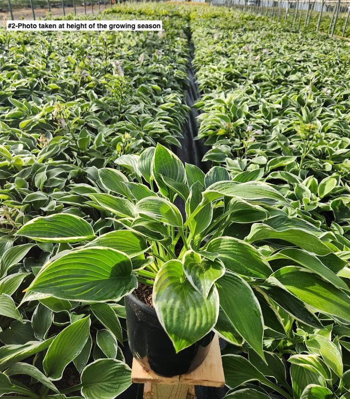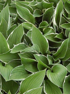 A colorful shade garden workhorse, this selection shines with heart shaped, dark green leaves ringed with striking white margins. Flower spikes climb above the foliage topped with lavender flowers in August.