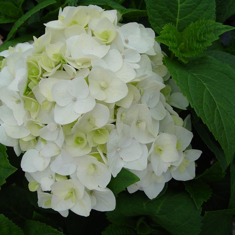 The latest craze to hit the Hydrangea world, 'Blushing Bride®' is the next of the Endless Summer® line of plants and, like its wildly popular older relative, it is a flowering demon that blooms on new wood and is a repeat bloomer to boot. Because of this ability to bloom on new wood, northern gardeners can plant 'Blushing Bride®' and still enjoy the signature summer snowball flowers that they have been denied until the advent of Endless Summer®. And what flowers they are! Huge, up to 6" diameter balls of pure white bloom emerge in mid to late June and continue blooming right on through until frost. As the flowers age, they take on a charming, light blue or pink blush that provides great contrast with newly emerging pure white blooms. 'Blushing Bride®' even has the advantage of far better foliage than its famous relative, sporting luxuriant, deep green leaves that are the perfect foil for the unending supply of snowy bloom. Easy to grow, 'Blushing Bride®' will perform best in a half a day of sun in moist well-drained soil. Plant a bunch for a summer filled with flowers!