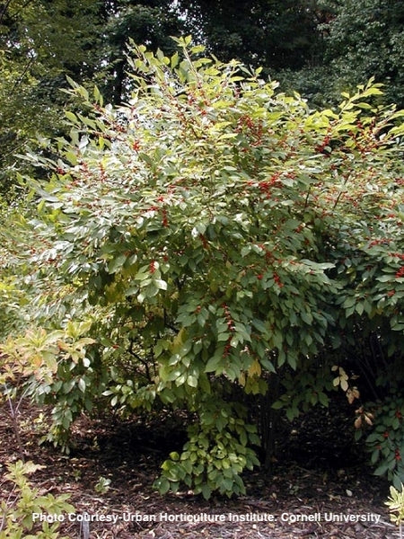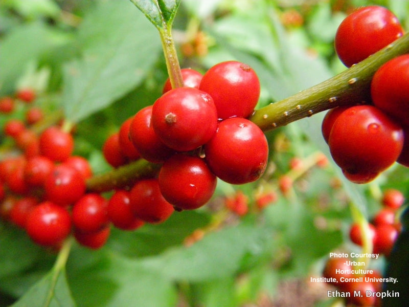 Description- There is no better fall and early winter show than the one that this great native plant provides with its stunning array of bright red berries. Even better, Winterberry is easy to grow and tolerates most sunny or partially sunny spots, even those with moist or wet soils. Winterberry grows at a steady, moderate rate and matures into a dense round plant that provides an excellent backdrop to any native landscape with its deep green, lustrous foliage. It also is an especially good landscape plant for the American Beauties landscape as it provides outstanding cover for native birds while also providing those attractive red berries they love.