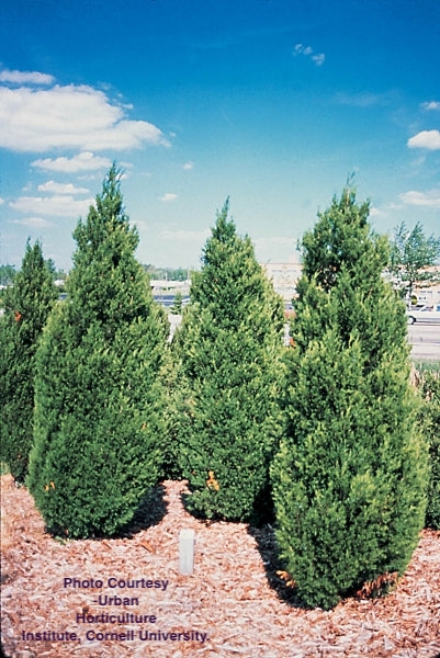 Description- Handsome, upright evergreen offers densely branched habit with vivid, dark green foliage. Needle-like foliage and pyramidal form is great for wide range of landscape uses. Tough, drought resistant, and reliable. A great candidate for hedging or border groupings. Attractive vivid, dark-green foliage. Excellent nesting cover for birds.