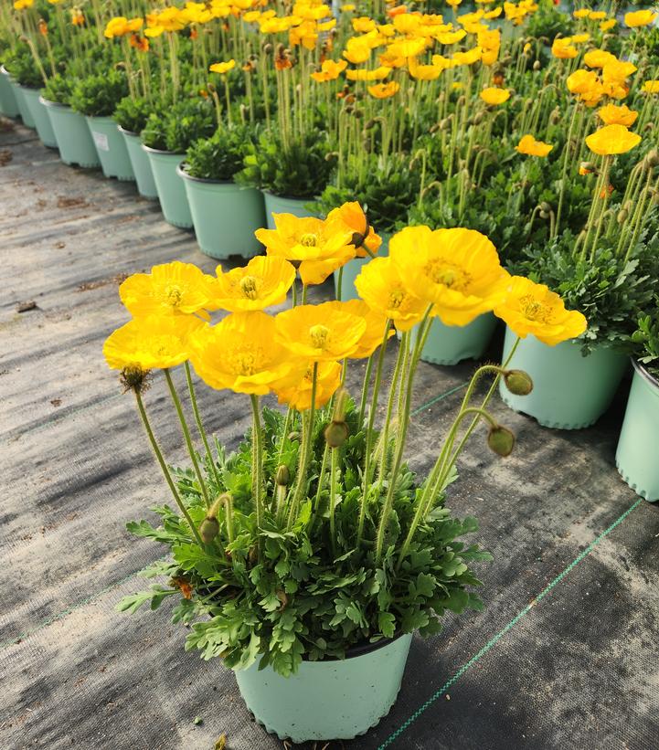 Deeply cut, medium green, hairy foliage forms a basal mound in early spring. In April, flower spikes rise above the foliage bearing a fat bud that opens to 2-3" diameter sunny yellow flowers with yellow stamened centers. This striking bloom continues from April into summer on an easy care plant that is as comfortable being grouped toward the front of a garden as it is being mixed in a container with other perennials.