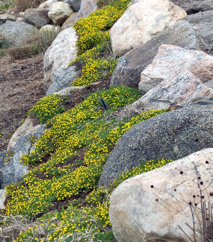 One of spring's subtle pleasures, this Potentilla is a vigorous grower and a vigorous mid to late spring bloomer with loose groups of golden-yellow flowers that enliven the ground with their color. Perfect for full sun, Potentilla needs well-drained soil and is an outstanding groundcover for dry areas.