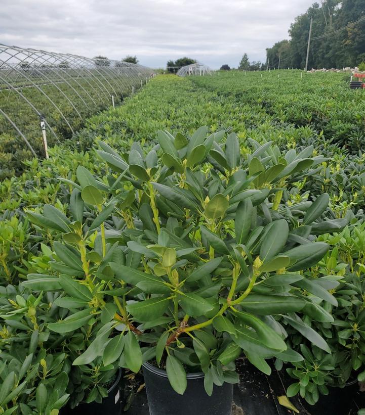 Our hardiest broadleaf white rhododendron, this variety is vigorous growing and dependably sets loads of lilac-tinged flower buds that open pure white with yellow blotches in mid-May. Superb leathery-green foliage.