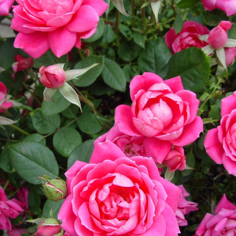 (Northern Hardy) Like its relative "Double Knock Out®', 'Double Pink Knock Out®' will offer you a rose that is so carefree in your garden that it will remind you of the best flowering shrub you can think of with a hundred times the color!! 'Double Pink Knockout' is a prolific bloomer with loads of flower buds rising above its dense, compact form and deep green foliage From May to October and opening to the sweetest double hot pink, 3" diameter flowers you'll ever see! It's a dream garden plant for your landscape because of the color but also because it is so carefree, so disease resistant that you'll want to mass them in any sunny spot you can find so you can fill your yard with season long color!!