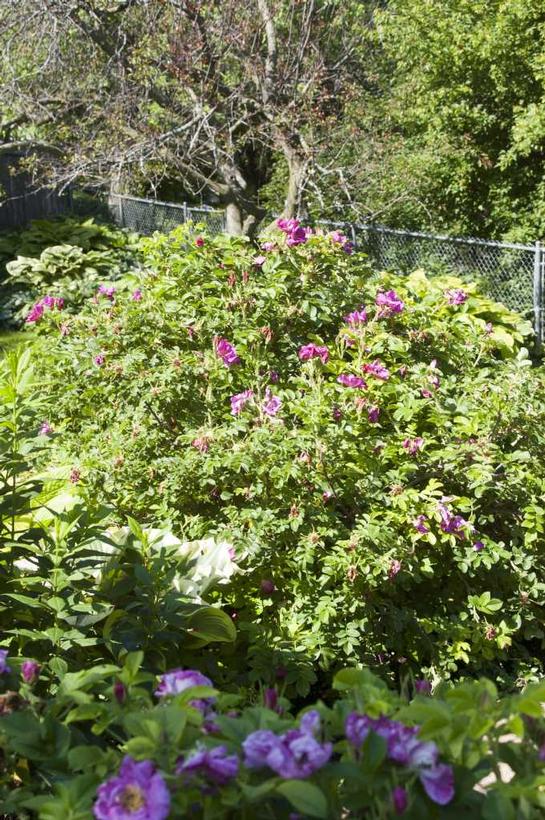 This rose is a hybrid Rugosa with a strong cinnamon fragrance emanating from its large semi double 4-5" flowers that bloom through the season. The color of this rose has been described as mauve or beetroot purple, suffused with magenta as each flower matures. The eye is streaked with white and it boasts golden yellow stamens that contrast nicely with the petals. Like the species the foliage is a dark green and glossy, it's resistant to the common fungal diseases and it has a nice upright and bushy habit. Own root.