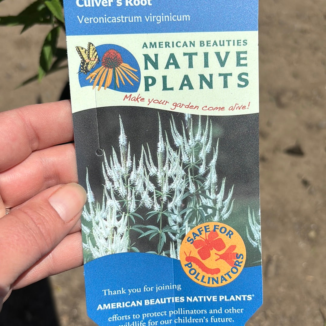 Looking like a Veronica on steroids, this large growing American Beauties perennial loves full sun and flowers like it's on steroids, too with an impressively long season of bloom to match its considerable size. This upright grower has whorled, lance-like leaves that unfurl on rapidly growing stems in the spring and are topped by long spires of buds by mid-May. These 9"+ long spires open with small white to pale blue flowers from top to bottom in late May and continue to bloom into mid summer on these spires and smaller side ones, attracting a considerable group of native butterflies throughout. Veronicastrum is impressive in stature and flower power and can make a big impact at the back of a garden and a big impact on your local garden critters.