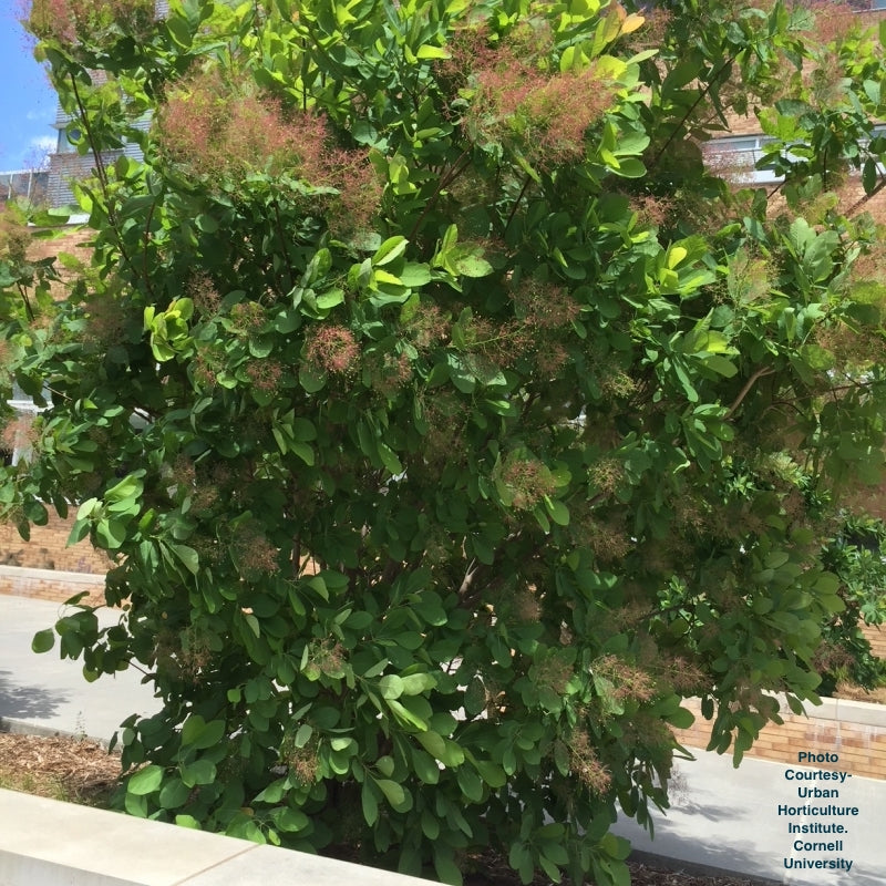 This large grower might take up a little space in the landscape but it will reward you with great looking foliage and unique bloom while providing outstanding shelter and nesting for native songbirds. Aggressive growing, this plant's branches are covered with roundish, cool gray-green foiliage. Branch tips top off with 6 to 10" clusters of 100's flower buds that bloom in June. While these flowers are fairly insignificant, each flower gives rise to a long, purplish-pink stalk that, when grouped with the 100's of others in the same cluster, gives this plant its famous smoky 'bloom' for which it was named. Easy to grow, this plant can be a summer showstopper in the landscape, sports tremendous orange to reddish fall foliage color and is a perfect plant for keeping near a bird feeder to house those hungry native birds.