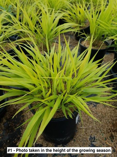 Electric. There's no other word to describe this plant's effect on the landscape than electric. Wide foliage blades are more upright and spiky than other Hakonechloa and form a tighter, slightly smaller mound in the garden. You won't notice the form difference, however since you will be dazzled by this plant's glimmering, glowing gold colored foliage without a speck of green. Plant it in partial shade for best results and plant it in groups for a galvanizing landscape effect that is impossible to achieve with any other plant!