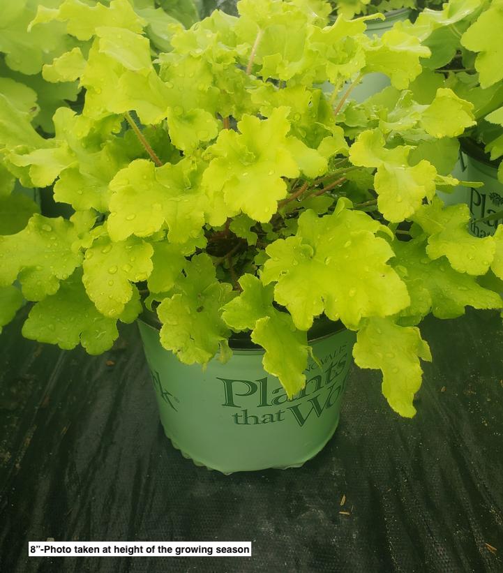 While this selection adds great color to the garden, it might be the texture it provides in the form of frilly, deeply cut foliage that will really catch your eye. 'Lime Marmalade' is an aggressive grower and aggressive about getting your attention with that unique foliage that emerges and forms a beefy rounded mound in April and that striking lime green to chartreuse foliage color that will light the darkness of any shady landscape spot. Like all Heuchera, 'Lime Marmalade' sends up thin flower stalks above the foliage with buds that bloom in May and June with white flowers that are attractive yet will still take a backseat to this plants color and texture. 'Lime Marmalade' prefers partial sun to full shade and is fabulous grouped in the ground or interspersed with other perennials in a planter to add that needed zing of color and texture