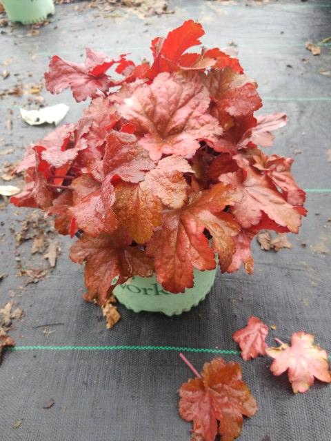 This brilliant Heuchera has the reddest leaves ever, a neat, mounded crown, and is a vigorous grower. The leaves are cut and somewhat ruffled and reddest in the spring and fall when the temperatures are cooler. The 14" spikes of white flowers in mid summer compliment and contrast with the foliage.