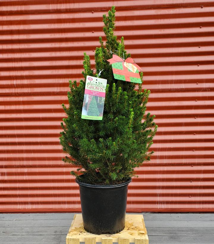 Picea glauca is a large evergreen with thin, flaky bark, and cylindrical bale brown cones. Needles are blue-green in color, half-inch long, and are quite aromatic when crushed. Find this tall conifer in upland areas and near lakes and streams.