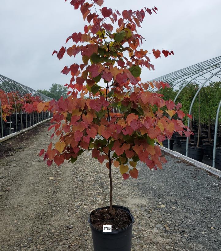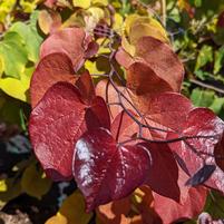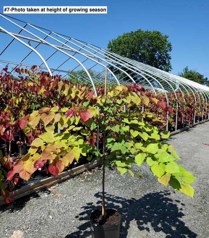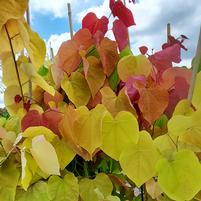 This Cercis has pink flowers that are followed by unique foliage, emerging burgundy-red, followed by bright yellow and green as it ages. The color display is persistent throughout the season, often showing four to five different shades on a single branch. Developed by the JC Raulston Arboretum at NC State University.