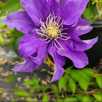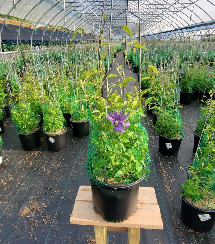 'Olympia' is a compact, deciduous, perennial climber with pinnate leaves divided into ovate or broadly lance-shaped, mid- to dark green leaflets and large, single, purple to violet-blue flowers from early summer into autumn.
