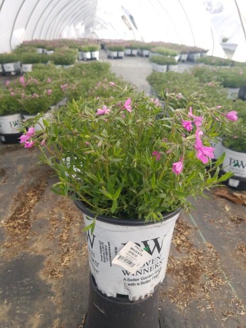 This hybrid Phlox forms a low, mounding habit of magenta pink, star-shaped flowers. It blooms about a week or so after Phlox subulata and does not spread aggressively.