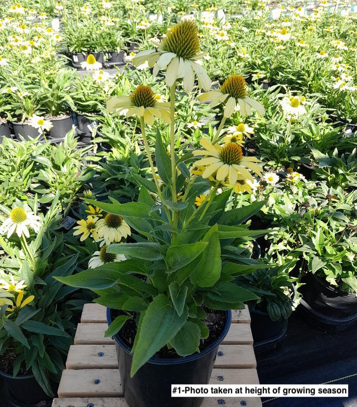 A double layer of overlapping, horizontally held yellow petals and a dark cone will "catch your eye" from mid-summer into the fall. Lush dark green foliage, excellent basal branching, and compact form are ideal for the sunny mixed perennial bed.