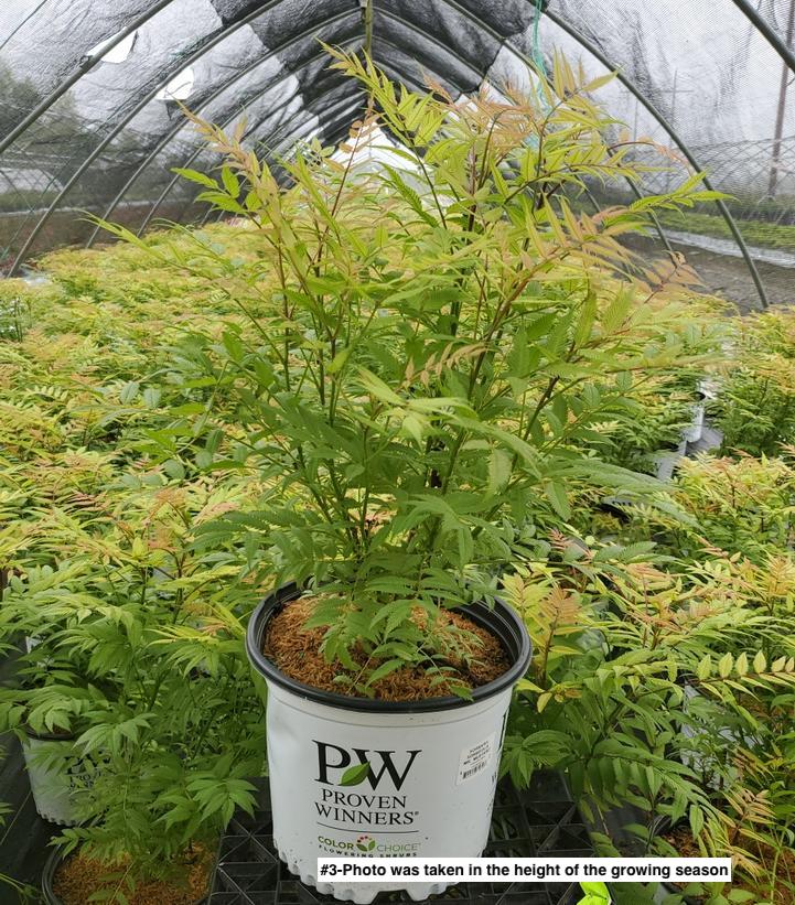A diminutive selection, about a fifth the size of the species and about half the size of 'Sem'. It boasts brighter and longer-lasting colorful springtime foliage that yields an array of yellow, orange, red, and even pink hues. White, astilbe-like, flowers appear in summer attracting butterflies and other pollinators. As growth slows in mid-summer, the foliage transitions to a Kelly green. Remove the suckers annually to maintain a mounded habit or plant in restricted area to contain its growth. Tolerant of alkaline and clay soils.