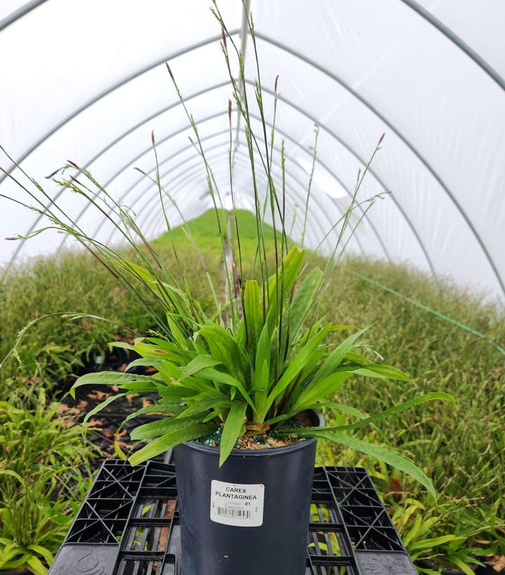 Carex plantaginea, is an ornamental woodland sedge with 1” wide, bright green leaves. In the spring, flower spikes rise above the foliage with dainty purple blooms.