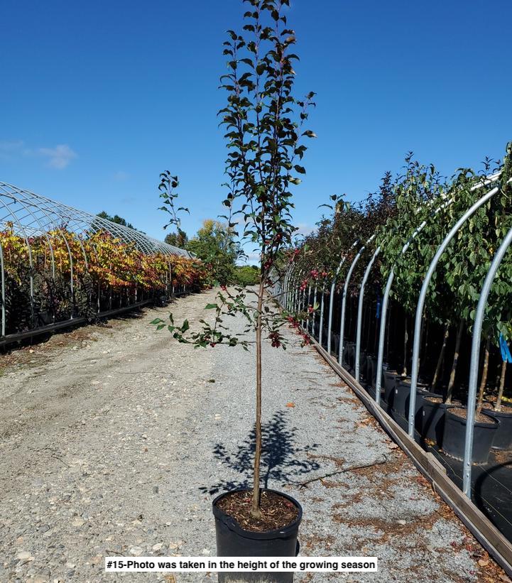 Description- Pink Spires Crabapple is an eye-catching ornamental tree known for its small bright red fruit. The tree has flowers bloom in the spring and has glossy reddish-purple foliage. Attracts birds and wildlife as the fruit persists on the tree!