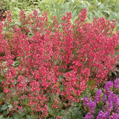 Heuchera 'Paris' displays large green leaves with silvery overlay all year long! In the spring, deep pink blooms erupt above the foliage in columns that rebloom throughout the summer. Not only is this Heuchera a gorgeous specimen to grow in containers or along borders and flower beds, it attracts bees, butterflies, and hummingbirds.