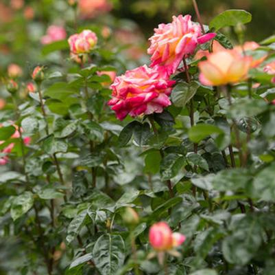 Love & Peace® Rose is an award-winning rose that continues to gain accolades for its superb blooms and disease resistance. Carmine red buds open to a warm blend of golden yellow that is edged with bright pink. Each double hybrid tea flower is large and slightly fragrant. An excellent cut flower, this rose will rebloom throughout the summer for continuous color. Unlike many older hybrid tea roses, the habit is compact and upright with lustrous dark green leaves that provide a nice backdrop to the blooms.