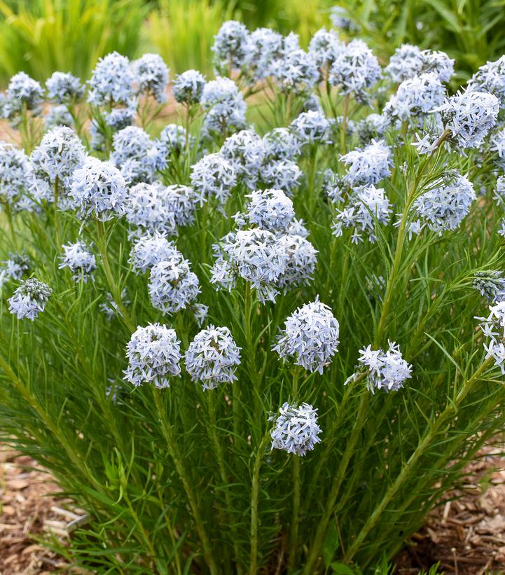 A spring-flowering perennial that provides foliage and texture interest throughout summer. Light periwinkle blue flowers are produced above dark green, threadleaf leaves.