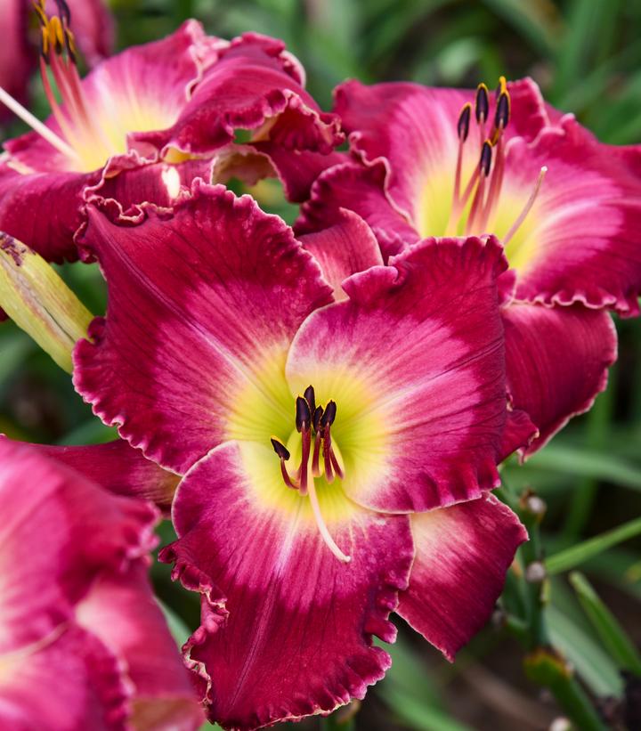 Massive 6" raspberry red flowers are complemented by a wide rosy pink eye that leads to a yellow throat. A thin white margin edges each petal. Flowers are held on proportionate scapes, just above the foliage. There are no hardiness concerns with this red daylily as it was bred and selected in Minnesota. Daylilies can survive many harsh conditions that other plants cannot including polluted city environments, slopes and poor and dry soils.