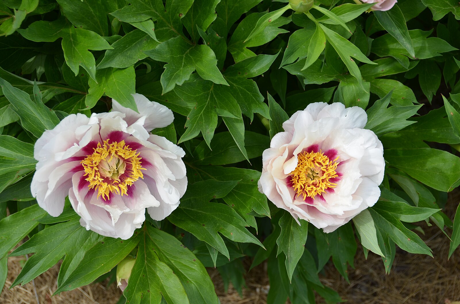 Itoh peonies are a cross between a general peony and tree peony. The roots are easy to divide, and the blooms are highly decorative. It is not unusual for itoh peonies to produce fifty or more blooms after established! Even after flowers are past, the foliage maintains beauty and remains a focal point in the garden. Cora Louise features large pure white flowers that are pleasantly fragrant. Buds open delicately to reveal lavendar petal hearts.
