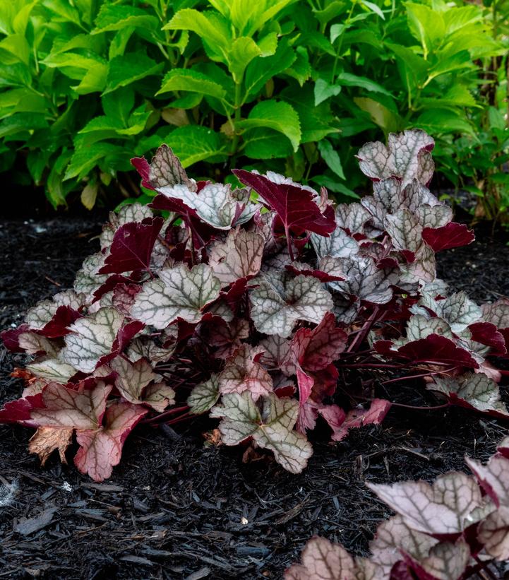 Heuchera Spice Curls™ features dense, compact growth with striking silvery purple foliage and red undersides, topped with vibrant red flowers from spring through summer. It thrives in full to part sun, growing 12-14 inches tall and 14-16 inches wide, and is suitable for zones 4-9.